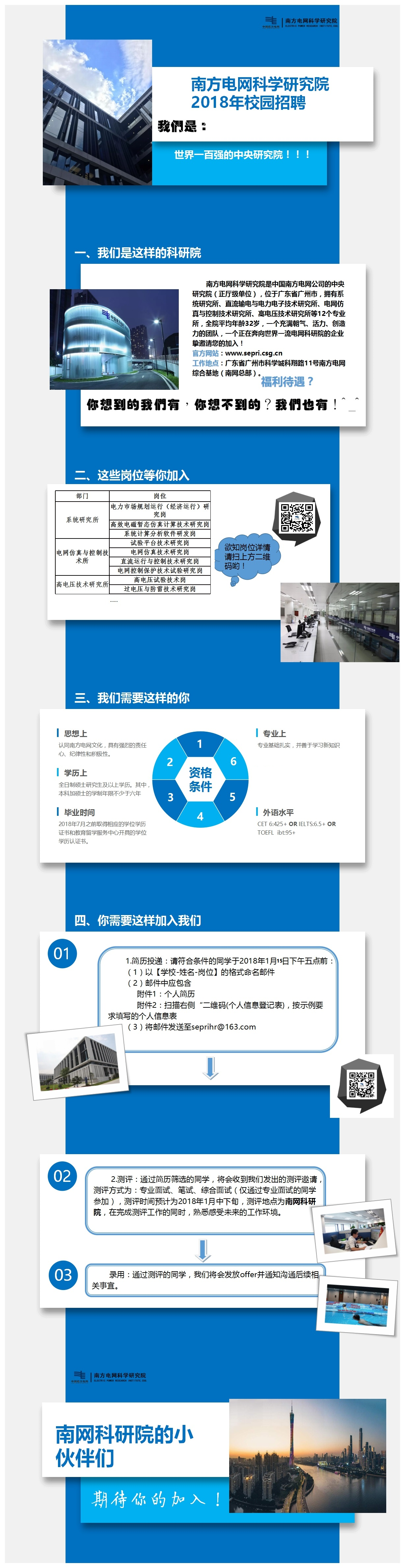 2.测评:通过简历筛选的同学,将会收到我们发出的测评邀请,测评方式为:专业面试、笔试、综合面试(仅通过专业面试的同学参加),测评时间预计为2018年1月下旬,测评地点为南网科研院,在完成测评工作的同时,熟悉感受未来的工作环境。