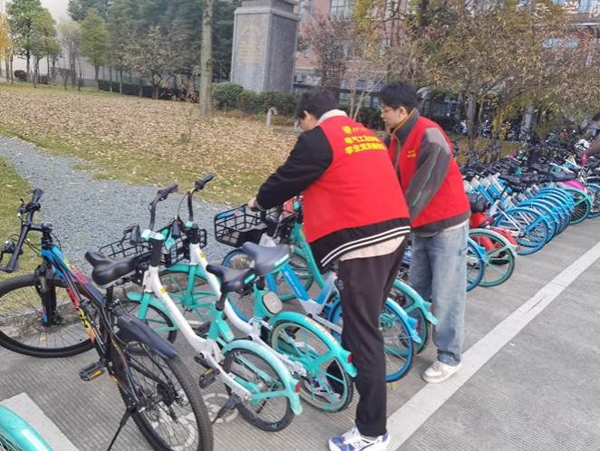 经过第一党支部和第五党支部党员和预备党员的努力,电气馆周围停车区域的自行车被摆放的整整齐齐,显得干净美观。