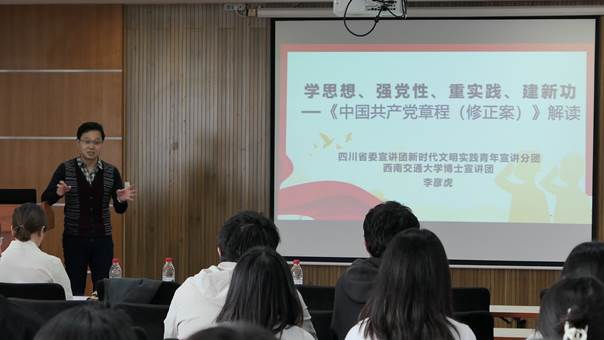 活动第二部分,由四川省委宣讲团新时代文明实践青年宣讲分团讲师、西南交通大学博士宣讲团成员李彦虎同志做《中国共产党章程(修正案)》解读。李彦虎同志从中国共产党章程的诞生与发展历程为切入点,带领大家对党章的基本知识进行回顾,然后重点对党的二十大对党章的新修订内容做了介绍,从党的历史发展、党的自我革新、新时代党的事业进步的角度,阐述了党章修订的深刻意义。