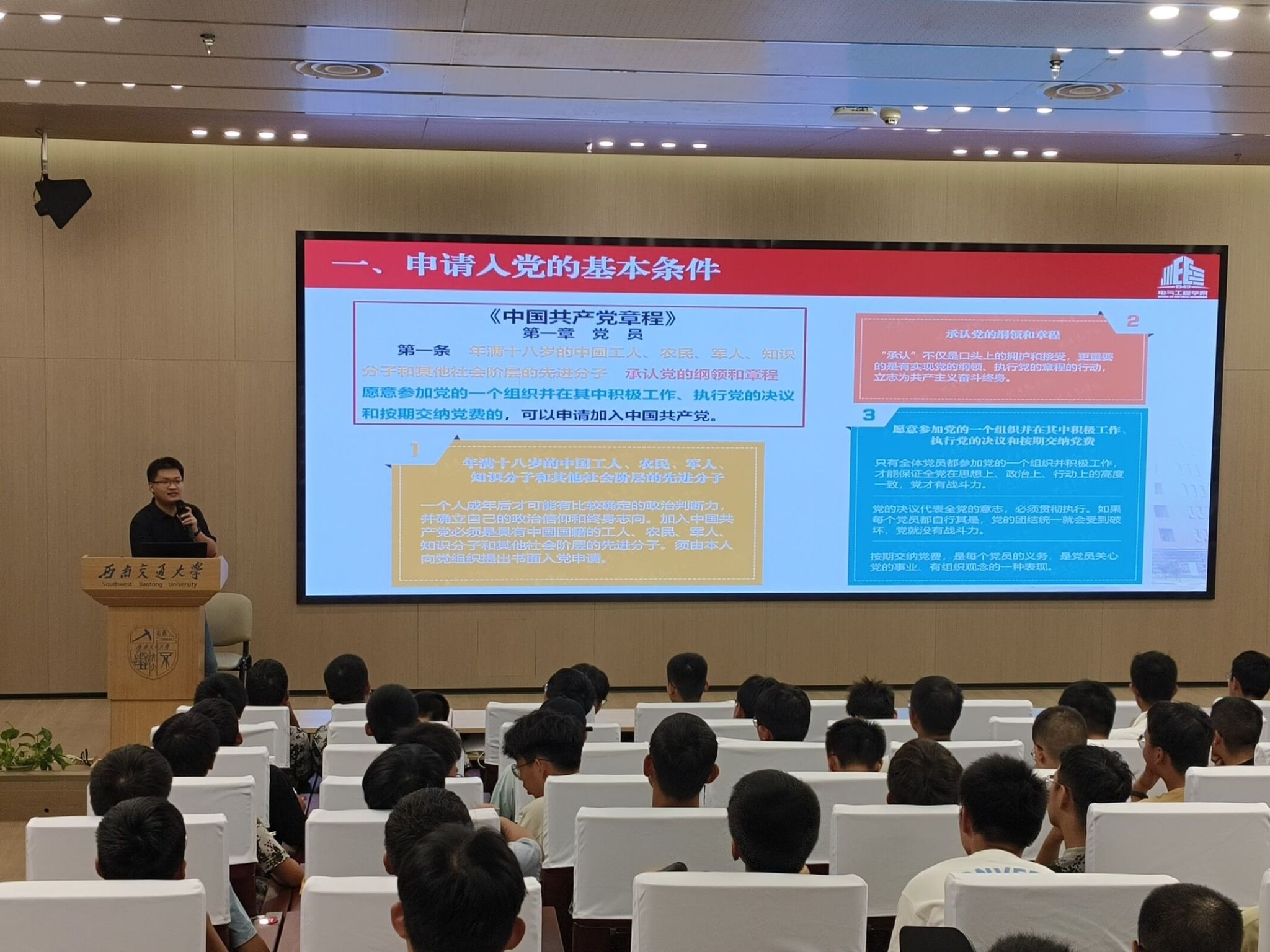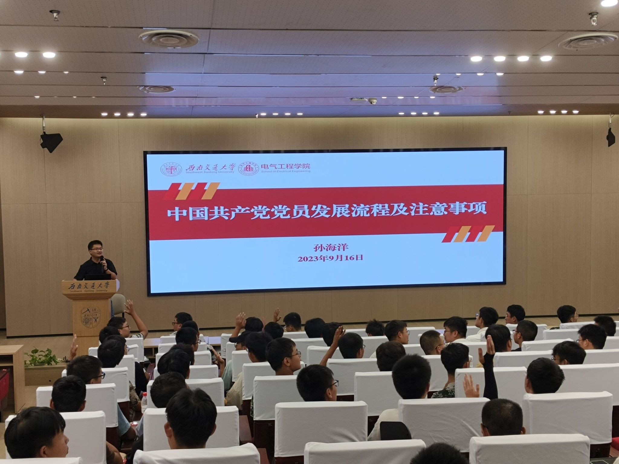 为深入学习贯彻习近平新时代中国特色社会主义思想,落实党的二十大重要精神,2023916日晚上2000,Fun88乐天堂官网 本科2023级在西南交通大学犀浦校区一号报告厅开展党员发展专题教育讲座。此次讲座由辅导员孙海洋老师主讲,Fun88乐天堂 本科2023级辅导员詹睿、罗霁轩和全体新生参与。