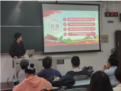 首先,唐茂森同志组织同学们观看爱国视频《建国大业》和《我和我的祖国》部分片段,拉开了爱国教育学习会活动的序幕。通过PPT向同学们展示新时代爱国主义学习会的内容,以新时代爱国主义为主题,围绕“决胜全面小康”,唐茂森同学通过七个章节,简要介绍了我们国家的近代发展史,展示了中国70年来的辉煌成就以及对新时代大学生的启发。