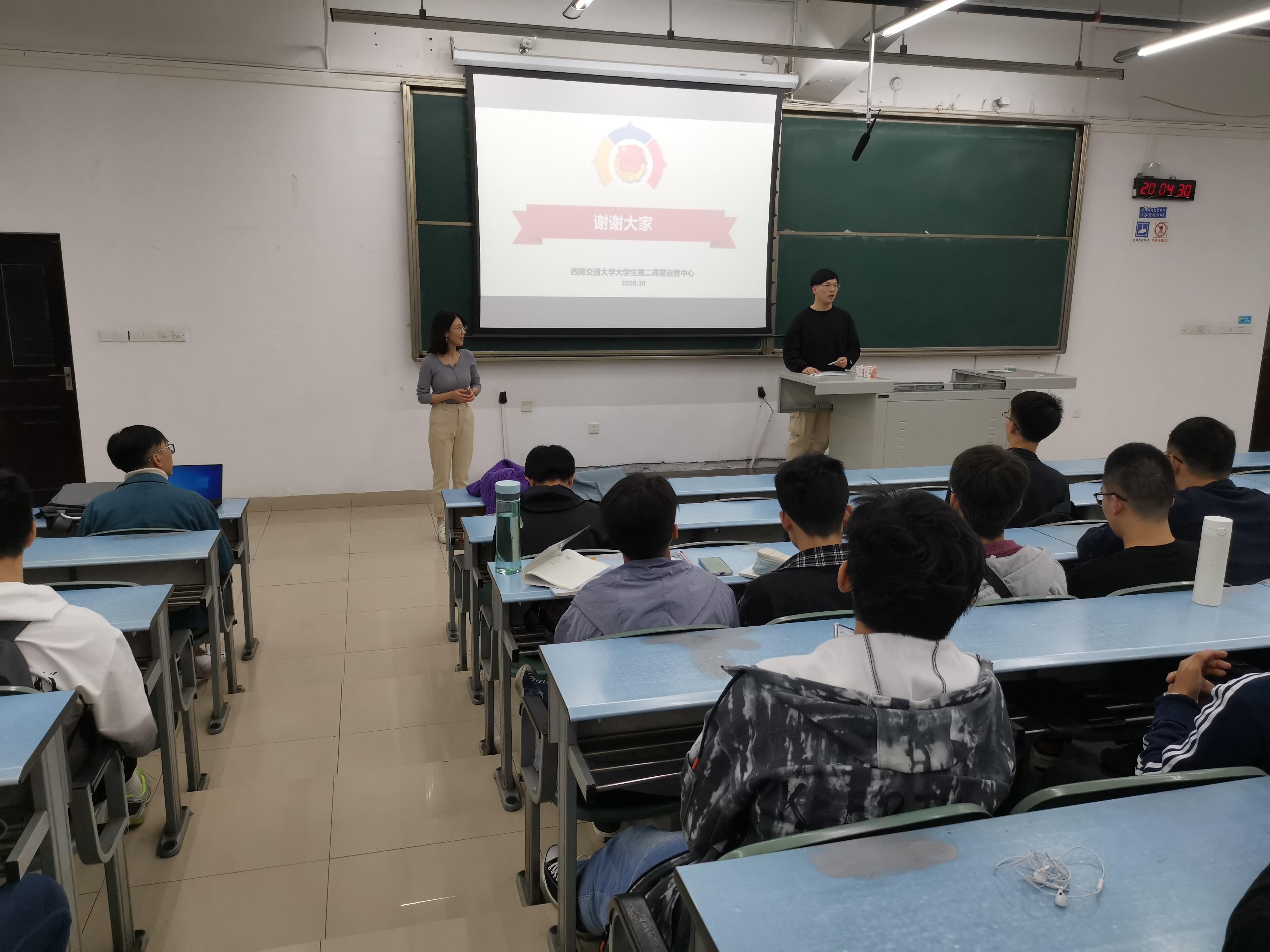 20201013日晚7时,Fun88乐天堂官网 在犀浦校区X2218X2321开展了“入学教育之第二课堂情况介绍讲座”,本次讲座由校团委汪宣霖老师主讲,本科2020级辅导员关怀、郭冰倩、赵娜及全体新生参加讲座。