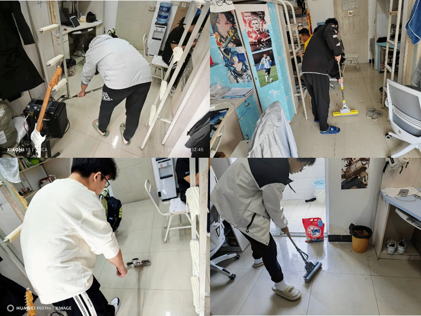同学们通过宿舍卫生打扫、清理废旧物品等形式开展宿舍劳动。通过改善宿舍环境,保障自己的身心更加健康。大家一起动手,与室友们在劳动中建立更紧密的联系,共同创造一个良好的宿舍生活环境。寝室大扫除活动将帮助学生改善宿舍环境,促进室友之间的合作与交流,培养学生良好的生活习惯,共同打造一个良好的学习生活环境。