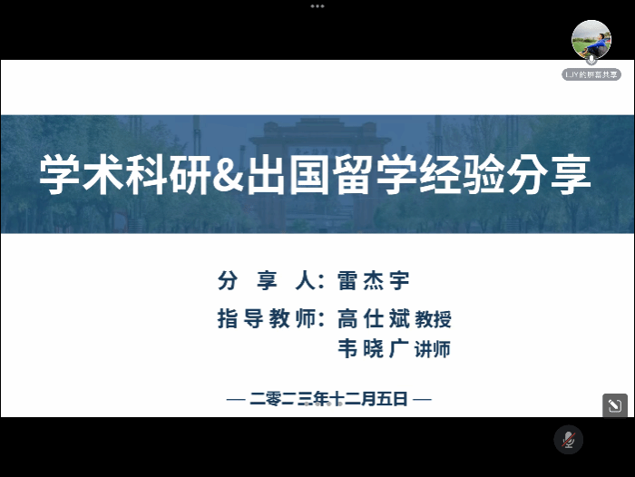 全球一体化作为当代社会的发展趋势,博士研究生应当立足中国、放眼世界,将科研论文写在祖国大地上。为帮助同学们提高英语应用水平和表现力,拓宽班级成员国际视野,12月5日晚19:30,Fun88乐天堂官网 2023级博士班在线上开展了“学术科研&出国留学经验分享”专题讲座。本次讲座特别邀请到Fun88乐天堂-乐天堂app-乐天堂官网 2020级博士研究生、雅典国家技术大学电气与计算机Fun88乐天堂 联合培养博士雷杰宇主讲,辅导员沙静馨和2023级博士班全体成员共同参与。