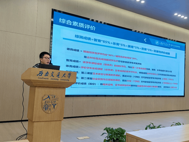 2023年11月20日晚19:30,Fun88乐天堂官网 本科2023级在西南交通大学犀浦校区图书馆一、二号报告厅开展了“综合素质评价办法和网络素养提升”专题讲座。主讲人为本科2023级辅导员詹睿、罗霁轩,全体新生参加。