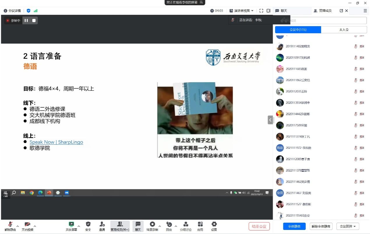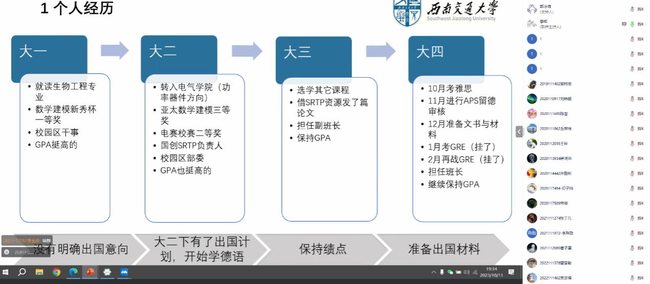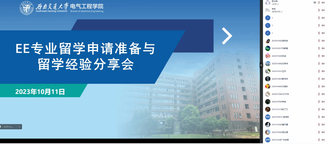 2022届电气工程及其自动化专业的李栋同学就留学规划、留学申请和语言准备相关经验进行分享。此次活动旨在为学生提供更多关于留学申请的指导,同时为有意向赴海外深造的同学们提供宝贵的经验分享平台。