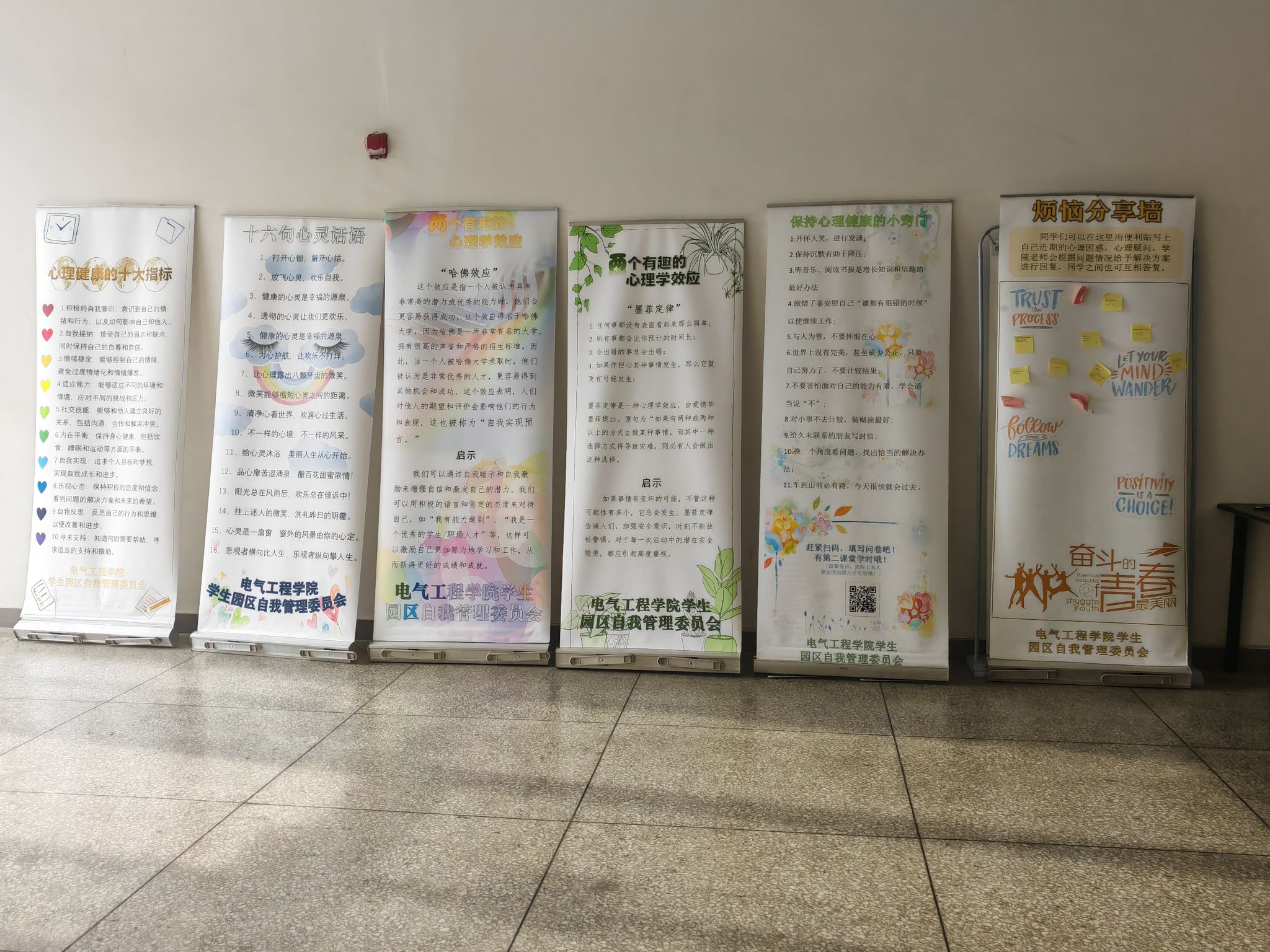 展板内容丰富多彩,既包括心理健康知识的普及,也涵盖心理学效应的科普,还有心理健康自我调节方法的介绍。活动旨在通过图文并茂的形式,让同学们更加直观地了解心理健康的重要性。