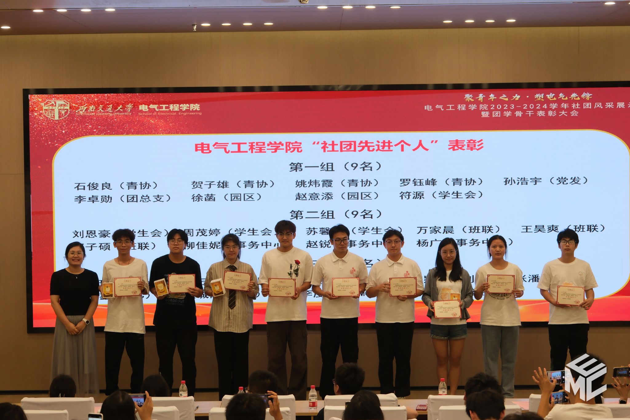 2024年6月14日19时,Fun88乐天堂官网 2023-2024学年“聚青年之力·塑电气先锋”社团风采展示暨团学骨干表彰大会于犀浦校区图书馆二号报告厅举办。Fun88乐天堂 团委书记张异老师,Fun88乐天堂 学生社团(组织)学生会、青年志愿者协会、媒体事务中心(EMC)、班级联合会(学业发展指导中心)、大学生科技活动中心、学生事务中心、研究生会、园区自我管理委员会、党员发展服务中心、辩论队、团总支共11个社团(组织)的指导老师及骨干成员们参加会议。
