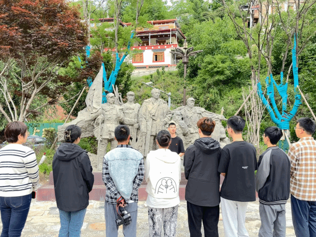 随后,在纪念馆广场陈设的《北上》雕塑群下,支部书记王顺同志以雕塑背后的故事为引入,回顾红军战士和藏族小红军举旗挑担,跟随毛泽东同志向北进发,爬雪山过草地的事迹,并分享了胡底烈士的壮举,介绍了伫立在马尔康市松岗镇胡底革命烈士纪念广场,一座名为“北望”的胡底烈士纪念碑,而纪念碑所望向的,正式两河口会议确定的北上方向。