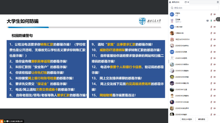 最后,郭老师提醒同学们要树立正确价值观、消费观,学习防骗知识,提高自身安全意识。并提示同学们下载“国家反诈中心”APP和注册“蓉城反诈卫士”,进一步规避外部风险。同时,若遇到相关问题及时联系辅导员并报警,共同营造安全和谐的校园环境。