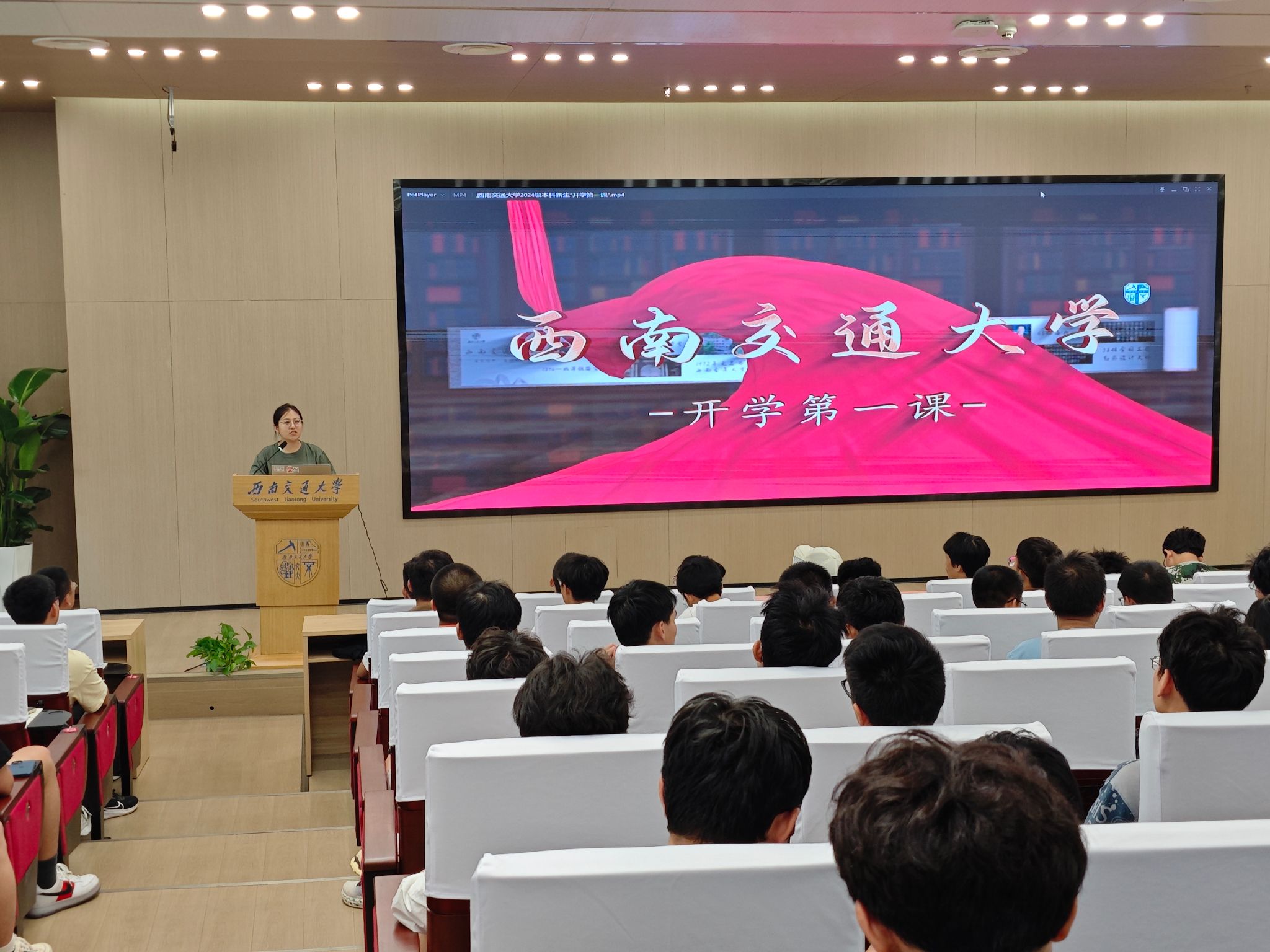2024年9月6日下午16时,Fun88乐天堂官网 本科2024级组织观看新生第一堂思政课《传承薪火 勇担重任 奋力书写新时代交大人为中国式现代化挺膺担当的青春篇章》,在新生中厚植爱国情、砥砺强国志、激发报国行。学校党委书记余敏明向新生介绍我校诞生历史及优良校风的形成,助力新生成长成才、成为德智体美劳全面发展的社会主义建设者和接班人。