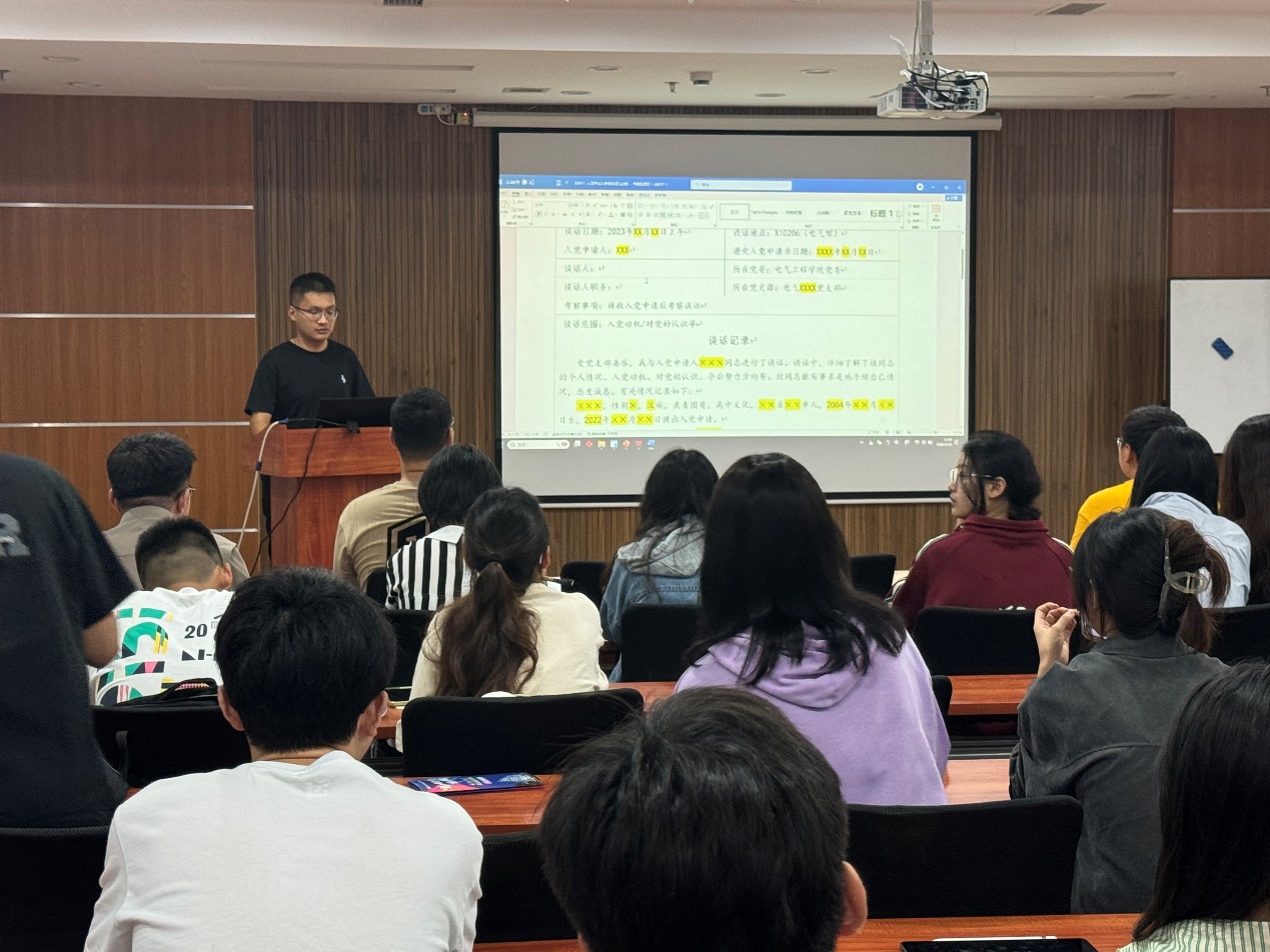 此后,孙海洋老师对于各个阶段需要撰写的党员材料进行讲解。结合西南交通大学入党材料清单,讲解了党员发展各个阶段需要撰写的材料,以及各材料的书写规范与注意事项,并对部分常见的问题进行提醒与解读。使参训老师和同学对材料撰写有了更为深刻的理解和掌握。