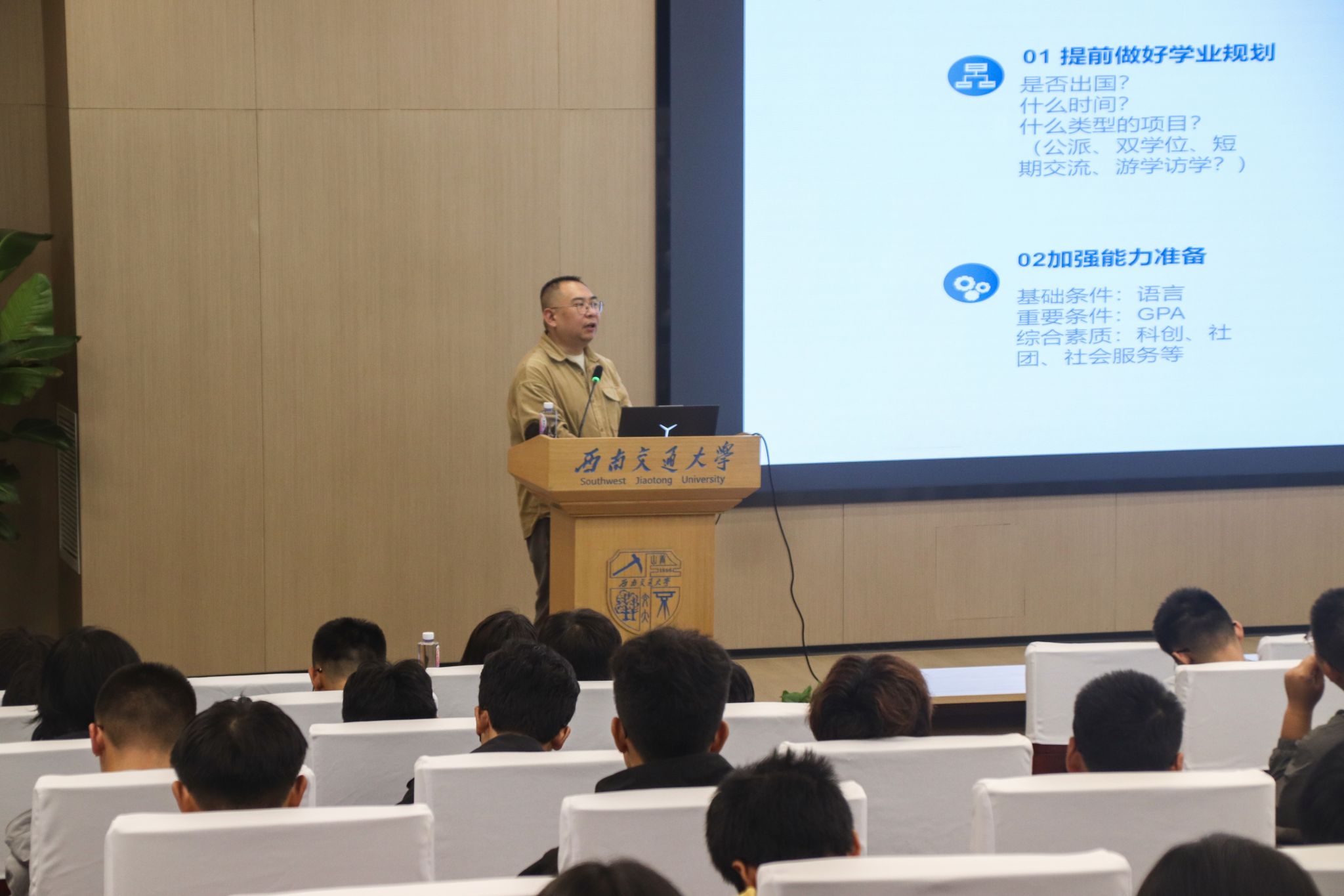 首先,廖莉副处长、杨帆主任针对新形势下学生的全球胜任力培养方式,从基本情况、政策解读、参与渠道与留学准备等方面为同学们进行了深入的剖析。老师们分析了历年的考研数据,引出西南交通大学出国(境)交流的基本情况,并分析学生在海外留学深造过程中的特点和思维误区。老师们还重点介绍了学校国际交流的相关政策以及交流和游学项目,并向同学们讲述了出国留学的规划方法和前期准备。