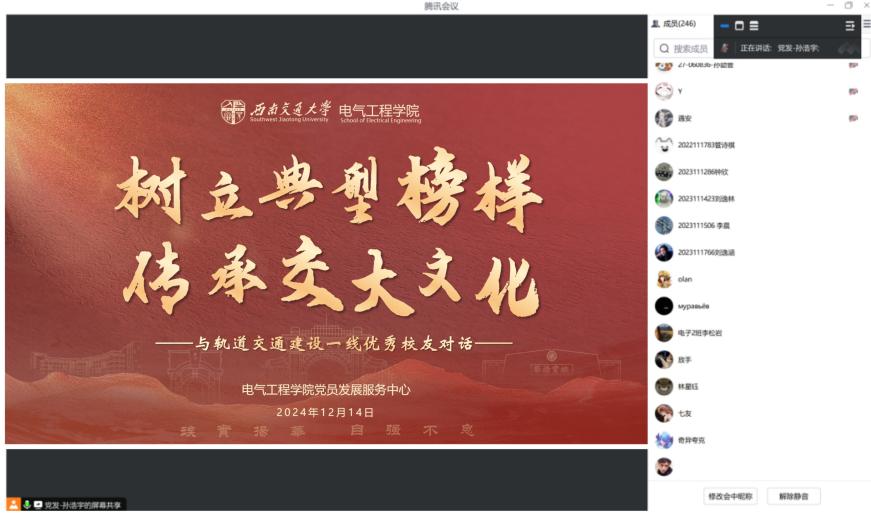 为使同学们进一步了解轨道交通行业发展现状及发展前景,做好职业生涯发展规划,Fun88乐天堂官网 党员发展服务中心于12月14日线上举办“就业大讲堂:树立典型榜样,传承交大文化——与轨道交通建设一线优秀校友对话”活动。本次活动邀请青年讲师团成员:本科2016届校友常竞文和硕士2022届校友周汉西,结合自身成长发展进行经验分享。近300名本科生参加活动,活动由党员发展服务中心主任孙浩宇主持。