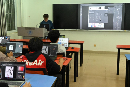 随后,在宣传部副部长范圣杰的讲解下,全体同学系统学习了PS软件的操作界面与核心功能。通过现场投屏演示,重点讲解了: 图层管理技巧(分组、蒙版、混合模式)、常用工具组应用(选框、画笔、文字工具)、图像调整功能(曲线、色阶、色彩平衡)和特效应用(颜色叠加、内发光、颜色渐变)等PS软件常用操作。讲解结束后,宣传部成员也为同学们提出的操作问题进行解决和指导。