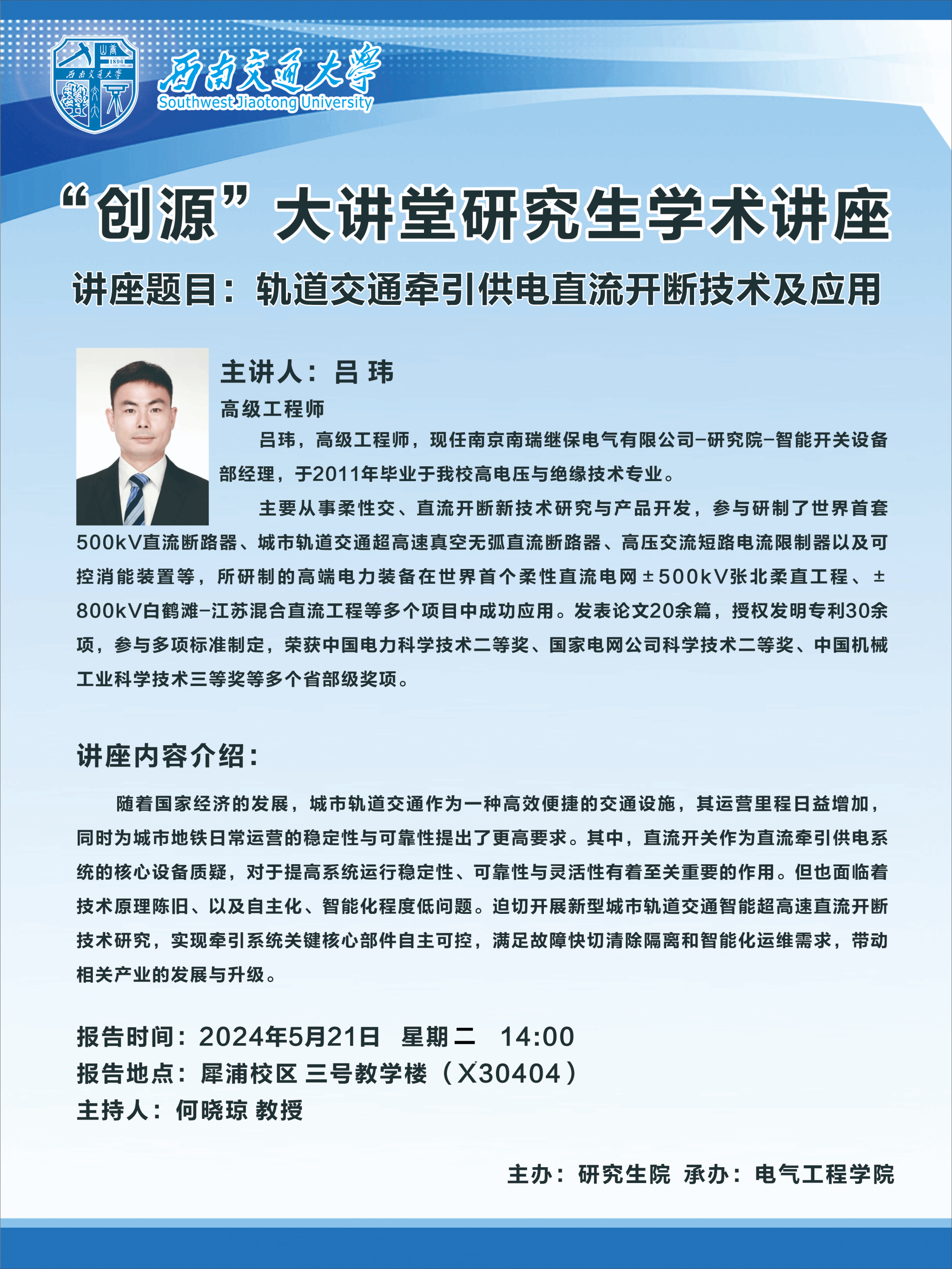 5月21日“创源”大讲堂:轨道交通牵引供电直流开断技术及应用