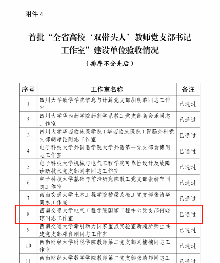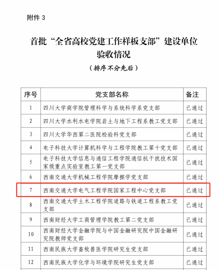 近日,四川省委教育工委公布了首批新时代四川高校党建示范创建和质量创优工作建设单位验收通过名单。Fun88乐天堂 党委、国家工程中心党支部、国家工程中心党支部书记“双带头人”工作室(何晓琼同志工作室)顺利通过验收。