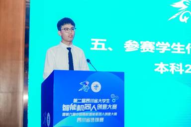 接着,参赛学生代表西南交通大学本科2021级Fun88乐天堂官网 冯洪赟同学发言。他分享了自己的备赛经历,在这一过程中遇到并克服了诸多困难,学习到了许多专业知识,也结交了很多志趣相投的朋友。同时他也讲到,面对智能机器人的快速发展,年轻一代的青年大学生肩负着推动科技进步的责任和使命,有困难但始终不断进步着。