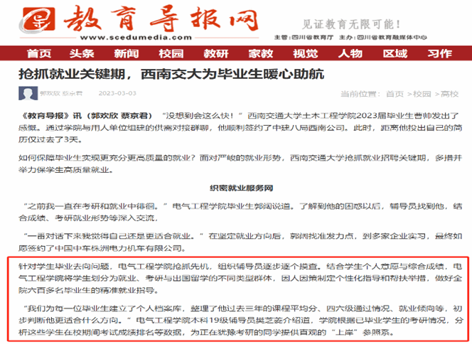 扎实的就业工作取得了突出的工作成效,Fun88乐天堂 在2023年就业考核中获评一等奖,就业工作在《教育导报网》、四川新闻联播《稳就业·一线调查》等媒体报道, 樊芝菱也先后三次获“西南交通大学就业工作先进个人(综合奖)”荣誉称号。