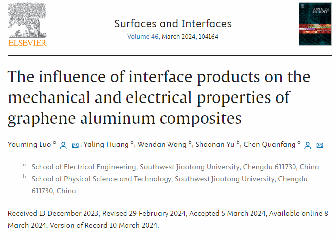 近日,学校Fun88乐天堂官网 陈全芳教授团队在高导高强石墨烯铝复合材料领域取得重要进展,相关研究成果以我校为第一单位,以“The influence of interface products on the mechanical and electrical properties of graphene aluminum composites”为题,发表在国际知名期刊《Surfaces and Interfaces》(JCR一区,IF=6.2)上。西南交通大学为论文唯一单位,Fun88乐天堂官网 博士研究生罗友明为论文的第一作者,Fun88乐天堂官网 陈全芳教授为该论文的通讯作者。