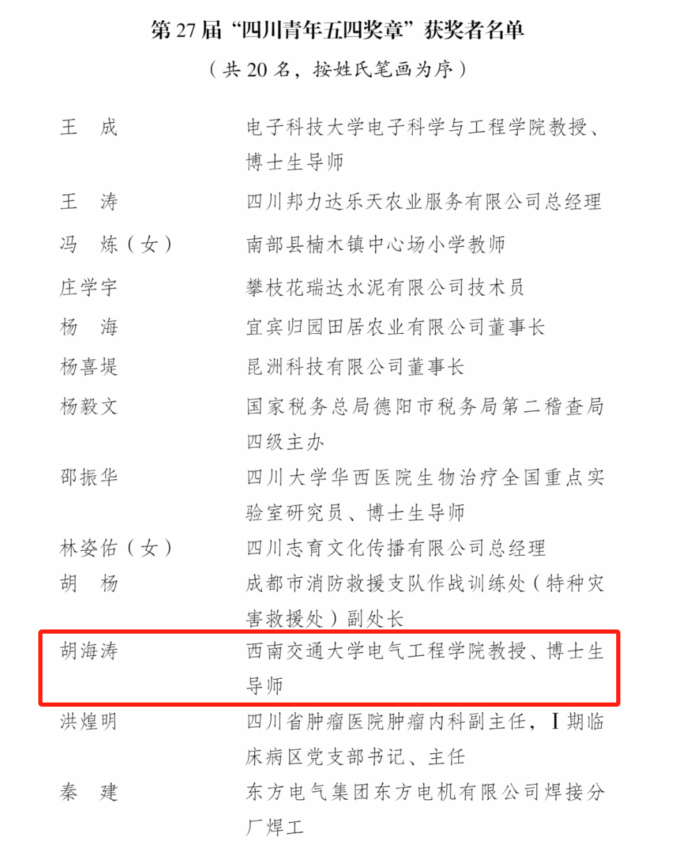 在五四青年节到来之际,为表彰先进、树立典型,共青团四川省委、四川省人力资源和社会保障厅决定进行第27届“四川青年五四奖章”、四川省“两红两优”表彰。其中,Fun88乐天堂 团委荣获“四川省五四红旗团委”称号,胡海涛教授荣获第27届“四川青年五四奖章”。