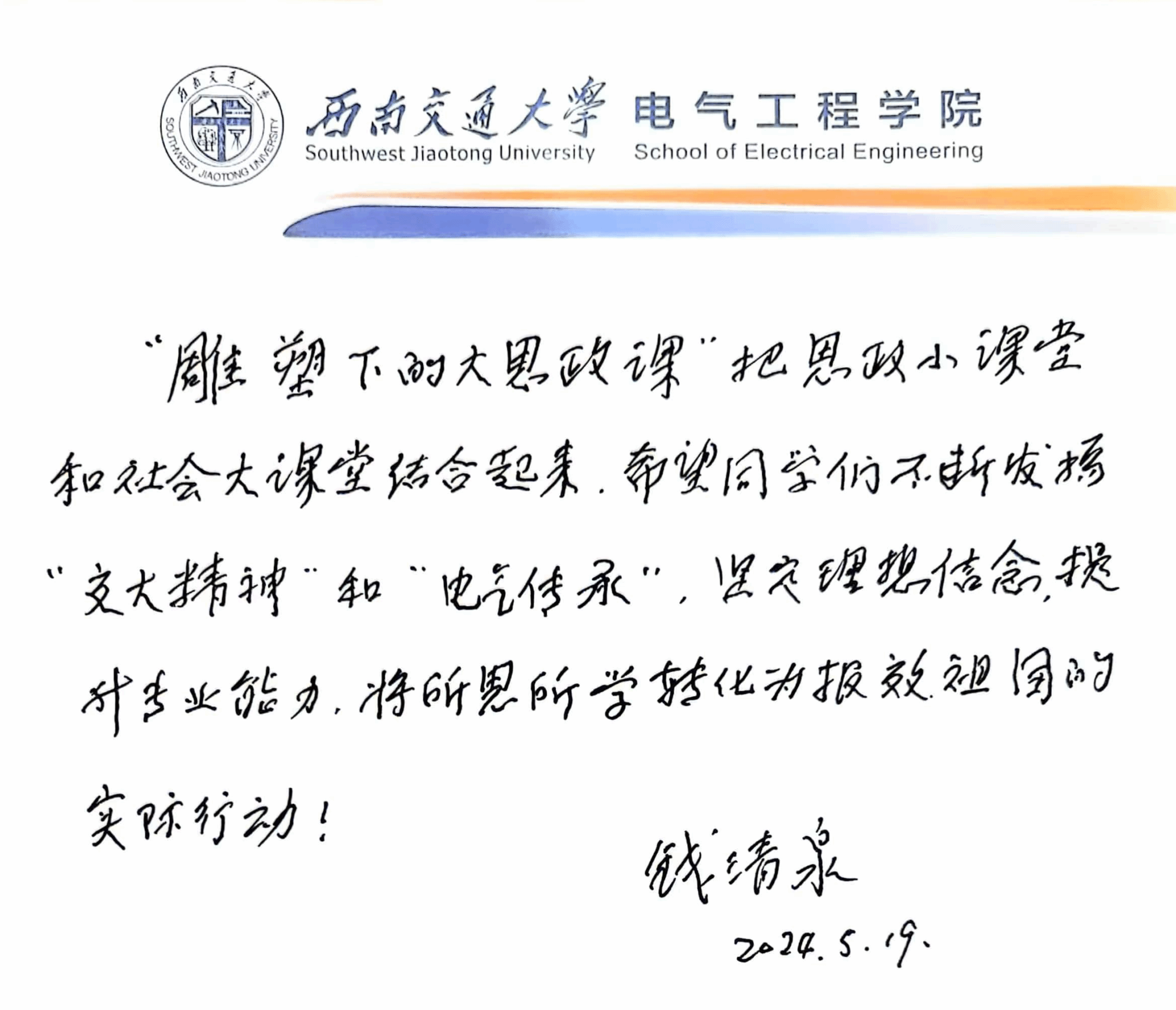 88岁高龄的钱清泉院士依然十分关心Fun88乐天堂 发展,点赞“雕塑下的大思政课”,肯定了Fun88乐天堂 长期以来坚持做好思想政治教育工作,形成了师长“善教”、学生“乐学”的良好风尚,寄语电气学子:“‘雕塑下的大思政课’把思政小课堂和社会大课堂结合起来,希望同学们不断发扬‘交大精神’和‘电气传承’,坚定理想信念,提升专业能力,将所思所学转化为报效祖国的实际行动!”