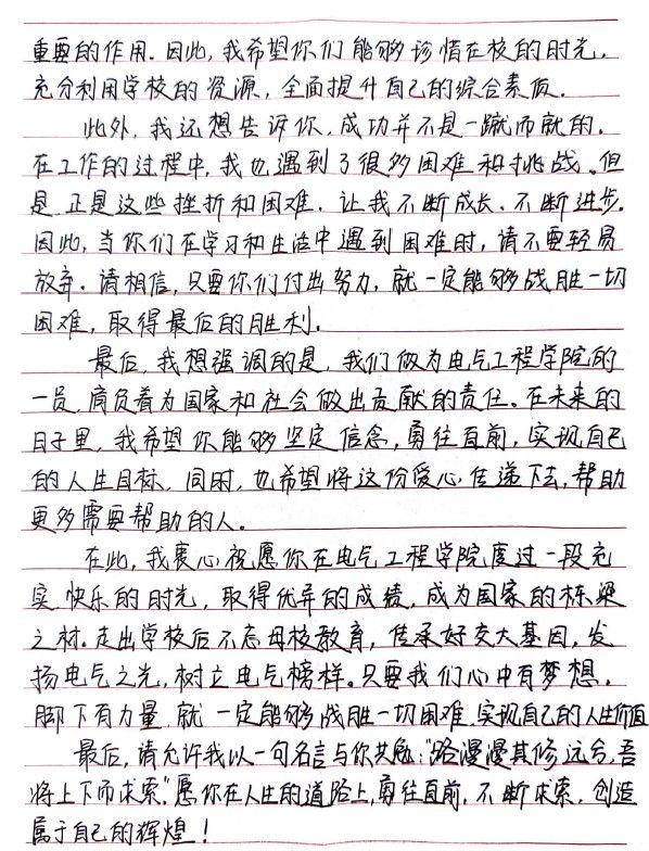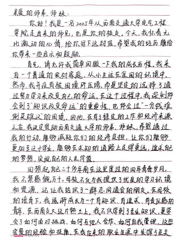 信件内容质朴而真挚,字里行间流露出这位院友对学校和Fun88乐天堂 的深厚感情。同每一位电气人一样,他的求学生涯充满挑战,但学校和Fun88乐天堂 的谆谆教导照亮了他的前行之路。现在,他不仅在自己的岗位上发光发热,更以电气人的责任和担当传递更多温暖。