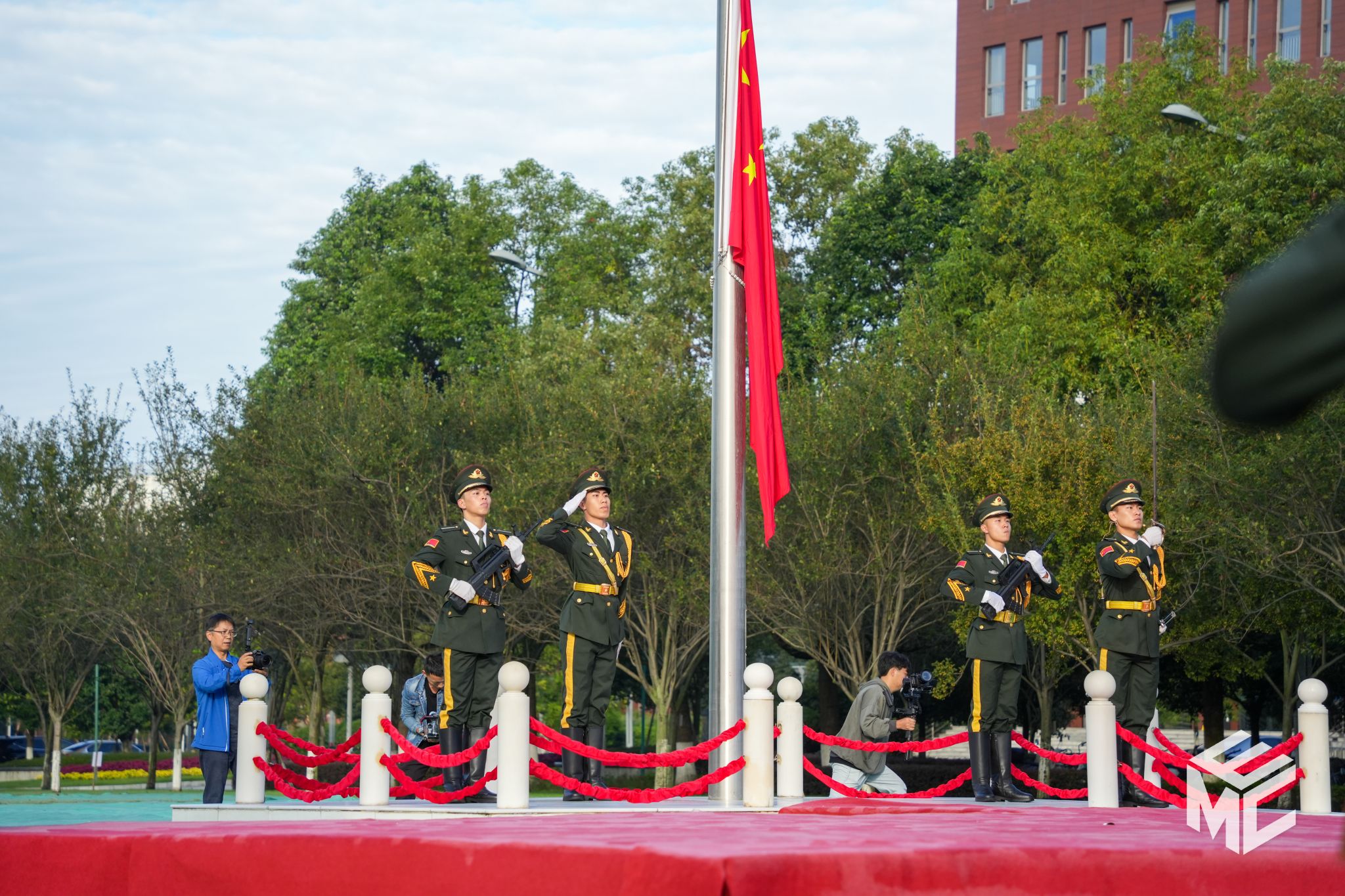 上午8时,Fun88乐天堂官网 师生代表有序入场。8时30分,学校国旗护卫队昂首阔步,精神抖擞,迈着铿锵有力的步伐,护送鲜艳的五星红旗入场。伴随着雄壮的国歌声,五星红旗冉冉升起。在这庄严的时刻,全体师生怀揣对祖国的崇高敬意,昂首肃立,面向高高飘扬的五星红旗行注目礼,为中华人民共和国七十五周年华诞送出最衷心的祝福。