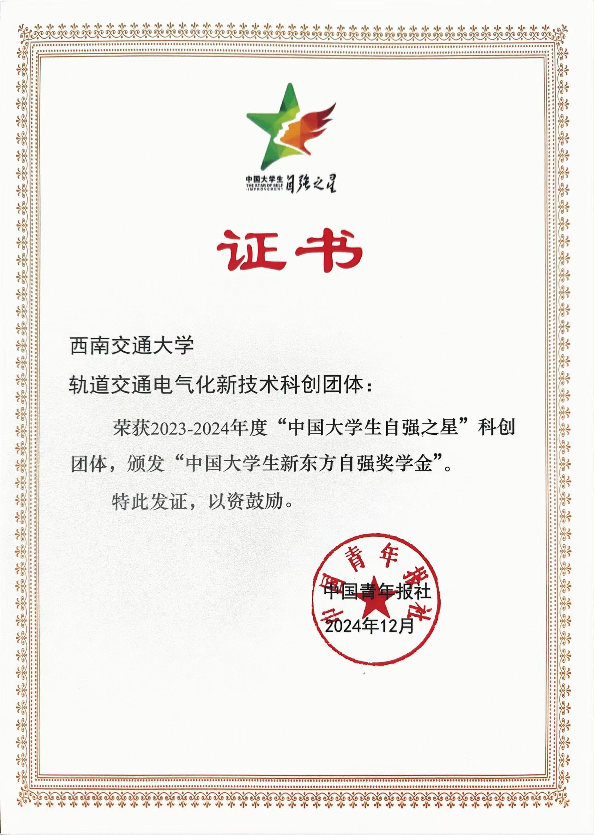 2023-2024年度“中国大学生自强之星”奖学金推报活动由共青团中央、全国学联指导,共青团中央基层建设部、中国青年报社、新东方教育科技集团、中国青年创业就业基金会联合举办。活动以“自信自强挺膺担当”为主题,旨在树立当代大学生中热爱祖国、品行优良、不畏艰难、自强不息的榜样。经各高校(市州)推荐、省级初评、拟推荐人选公示等环节,Fun88乐天堂-乐天堂app-乐天堂官网 轨道交通电气化新技术科创团体荣获2023-2024年度“中国大学生自强之星”科创团体(全国仅100支科创团体获得该荣誉)。该科创团体成员共41人,其中教师8人,在校学生33人。