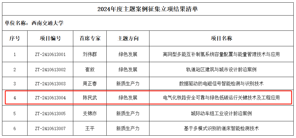 近日,教育部学位与研究生教育发展中心公布了2024年度主题案例立项结果,我校共有6项主题案例成功获批。其中,我院陈民武教授担任首席专家申报的《电气化铁路安全可靠与绿色低碳运行关键技术及工程应用》(项目编号:ZT-2410613004)成功获批。