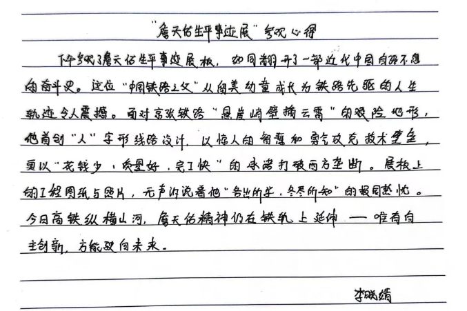 参观詹天佑生平事迹展,我深受震撼。詹天佑在艰难时局下,以坚毅决心和卓越智慧建成京张铁路,打破了外国人的质疑。从时速 35 公里到 350 公里的跨越,是一代代铁路人传承詹天佑精神、不懈奋斗的成果。作为电气工程专业学子,我定以先辈为榜样,在专业领域深耕,用知识与汗水为我国电气事业发展添砖加瓦。