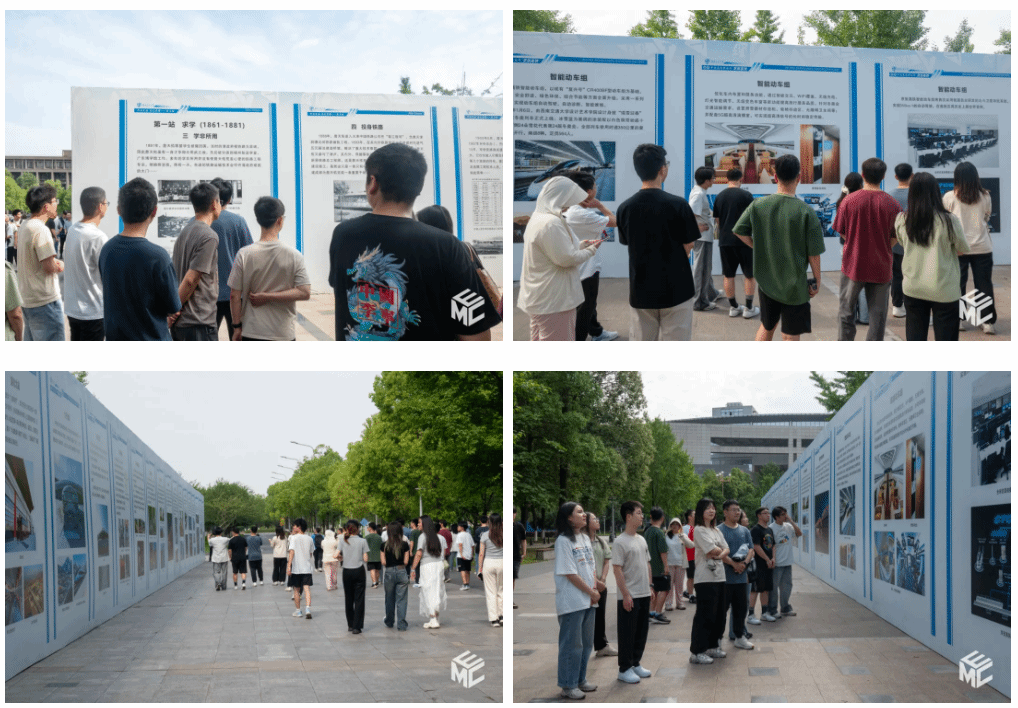 团员青年们有序围绕展板参观。展览分别以《第一站求学(1861 - 1881)》《第二站报国(1881 - 1918)》《第三站缅怀(1919 - 2024)》《走进中国高铁新标杆——京张高铁》四部分展开,通过大量珍贵史料,全景式呈现了詹天佑先生波澜壮阔的一生。团课结束后,全体师生回到主展板前拍摄大合影,为此次意义非凡的主题团课画上圆满句号。