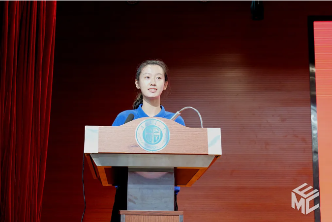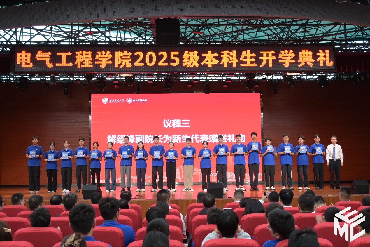 新生代表陈沫同学以“逐梦交大电气,共赴青春新程”为题发言。她讲述了曹建猷院士等前辈事迹带给她的感动,深刻阐释了自己对电气精神的理解。她代表全体新生,表示将在大学四年里播下三粒梦想的种子:一是“向下扎根,向上绽放”的学业之种,在知识的滋养中生长;二是“自主独立,奔赴美好”的生活之种,从“被照顾”走向“能担当”;三是“自洽内求,达观内省”的自我之种,孕育更丰富的灵魂,写好属于这一代人的青春答卷。