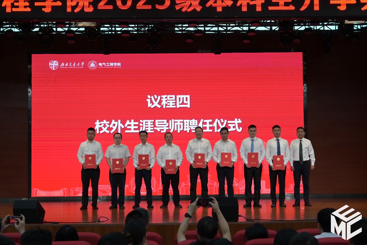 典礼上,马光同院长为他们颁发聘书:电气1班校外生涯导师陈世浩(中铁二院工程集团有限责任公司机动院党总支书记、院长)、电气2班校外生涯导师吕玮(南京南瑞继保电气有限公司研究院部门经理)、电气3班校外生涯导师樊东(国家电网有限公司西南分部高级专责)、电气4班校外生涯导师王成杰(乐山市委组织部研究室副主任)、电气5班校外生涯导师侯黎明(中国铁路设计集团有限公司机环院机辆所所长)、电气6班校外生涯导师金沧海(中铁武汉电气化局集团有限公司党建工作部副部长、机关党委副书记、纪委书记,工会主席)、电气9班校外生涯导师杨佳(中铁二院工程集团有限责任公司电化院副总工程师)、电气12班校外生涯导师王利军(中铁二院工程集团有限责任公司机动院总工程师)。这些来自各行各业的专家翘楚将成为同学们大学生涯中不可或缺的“引路人”。