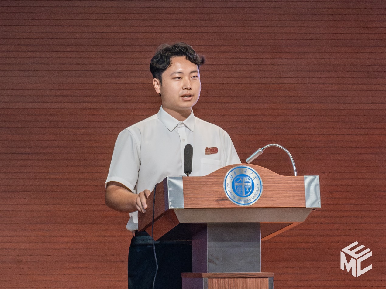 2022级本科生马杨作为高年级学生代表发言。他分享了自己从一度陷入“绩点内卷”的焦虑,到跳出舒适区、寻求全面发展的成长心路。通过参与科创竞赛和担任团支部书记的经历,他深刻体会到大学是多元化的成长平台。他鼓励学弟学妹们:一要筑牢基础,绩点是成长的“副产品”而非全部目标;二要拥抱实践,工科生的成长离不开动手;三要坚守热爱,记住“直线做事,曲线成长”的智慧,成长为独一无二的自己。
