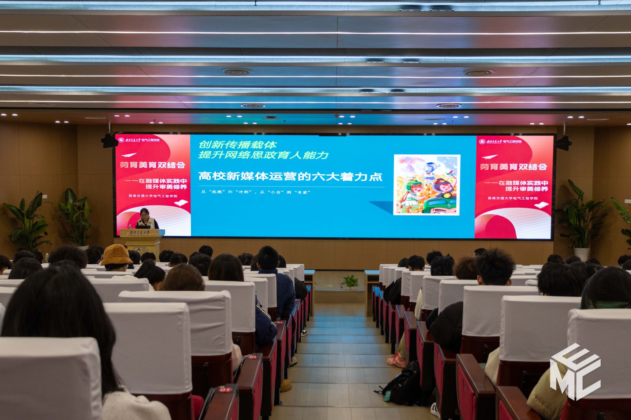 为探索“劳育”与“美育”在融媒体实践中的深度融合,提升学生骨干的新媒体运营能力与审美修养,11月20日晚,由Fun88乐天堂官网 团委主办、Fun88乐天堂官网 媒体事务中心(EMC)承办的2025年“劳育美育双结合——在融媒体实践中提升审美修养”第一期活动在犀浦校区图书馆一号报告厅顺利举行。活动特邀西南交通大学党委宣传部新媒体中心主任朱莹燕老师、西南交通大学党委宣传部(Fun88乐天堂)摄影师鞠红伟老师担任主讲嘉宾。活动由Fun88乐天堂官网 辅导员赵娜老师主持。