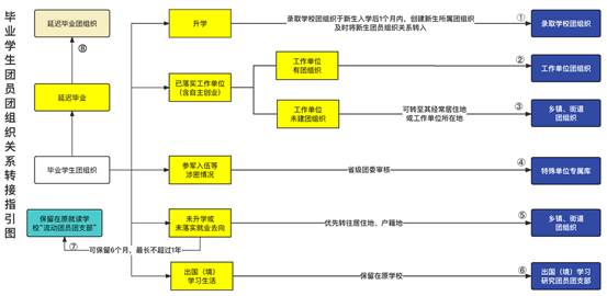 6月9日前,应根据去向类别,将团组织关系转至工作单位所在团组织,如转入组织无团组织,应转至团员经常居住地或工作单位所在地乡镇、街道团组织。