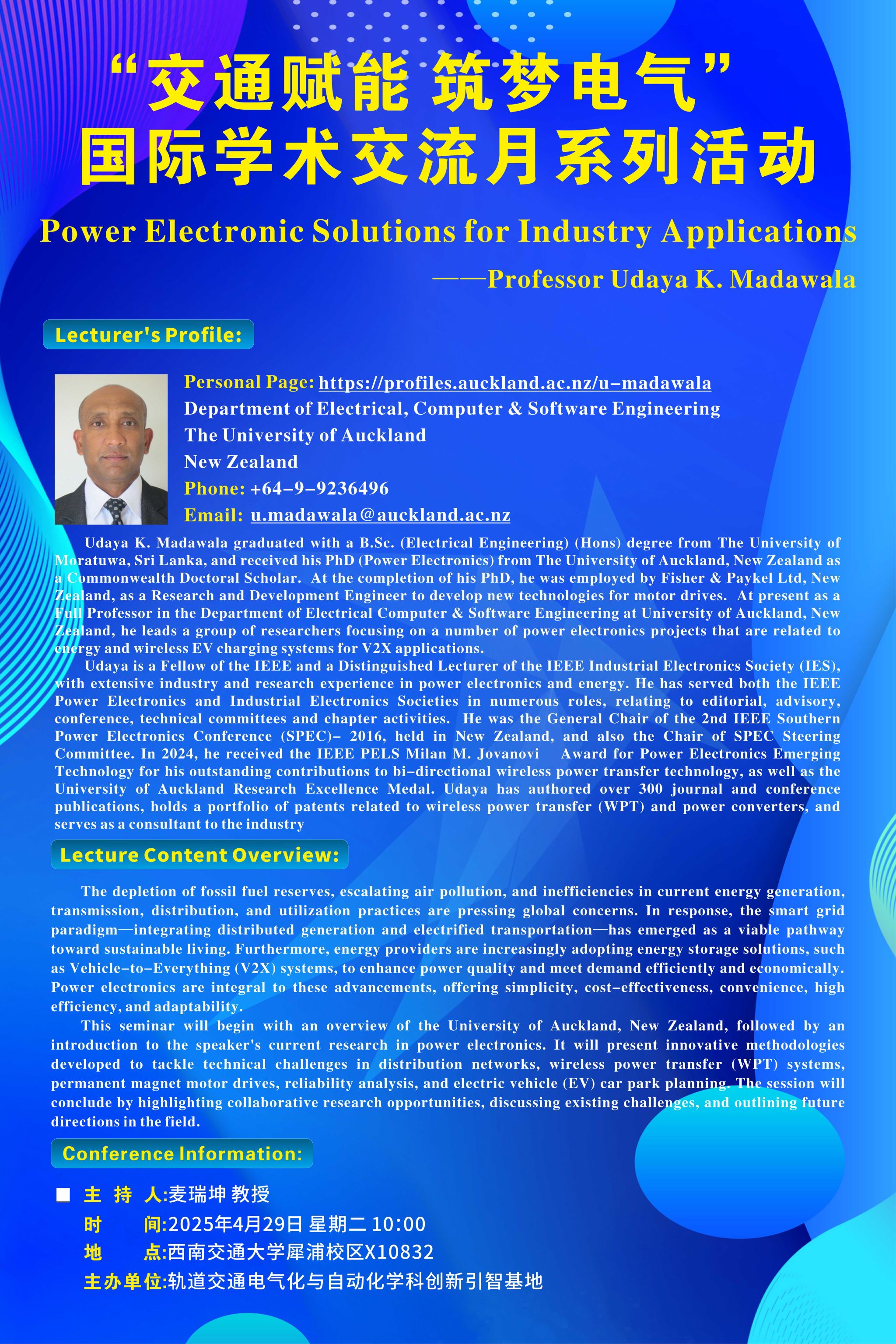 The depletion of fossil fuel reserves, escalating air pollution, and inefficiencies in current energy generation, transmission, distribution, and utilization practices are pressing global concerns. In response, the smart grid paradigm—integrating distributed generation and electrified transportation—has emerged as a viable pathway toward sustainable living. Furthermore, energy providers are increasingly adopting energy storage solutions, such as Vehicle-to-Everything (V2X) systems, to enhance power quality and meet demand efficiently and economically. Power electronics are integral to these advancements, offering simplicity, cost-effectiveness, convenience, high efficiency, and adaptability. This seminar will begin with an overview of the University of Auckland, New Zealand, followed by an introduction to the speaker's current research in power electronics. It will present innovative methodologies developed to tackle technical challenges in distribution networks, wireless power transfer (WPT) systems, permanent magnet motor drives, reliability analysis, and electric vehicle (EV) car park planning. The session will conclude by highlighting collaborative research opportunities, discussing existing challenges, and outlining future directions in the field.